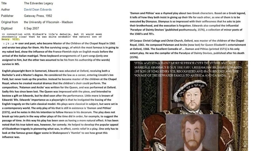 On page 49, he states: ‘There are many circumstances in Richard’s life and the events thereafter that suggest while Richard Edwardes was reared by the Edwardes family, that he was the natural son of Henry VIII. There is no other explanation for the close involvement with the House of Tudor.’”