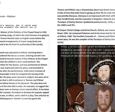 “A book on the subject was written in 1992 by David Dean Edwards called 'Edward's Legacy' … Richard Edwards was educated at Oxford, receiving both a Bachelor's and a Master's degree… The Queen was impressed with the piece, and intended to bestow a gift on Edwards, but he died soon after the performance.”