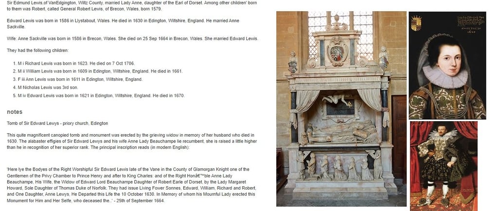 Genealogy Summary for Sir Edward Lewis and Lady Anne Sackville’s Children This summary reflects the most accurate, verified historical information about the children of Sir Edward Lewis and Lady Anne Sackville, foundational ancestors in the Lewis Legends of Royalty, Patriots, and Pioneers family line.